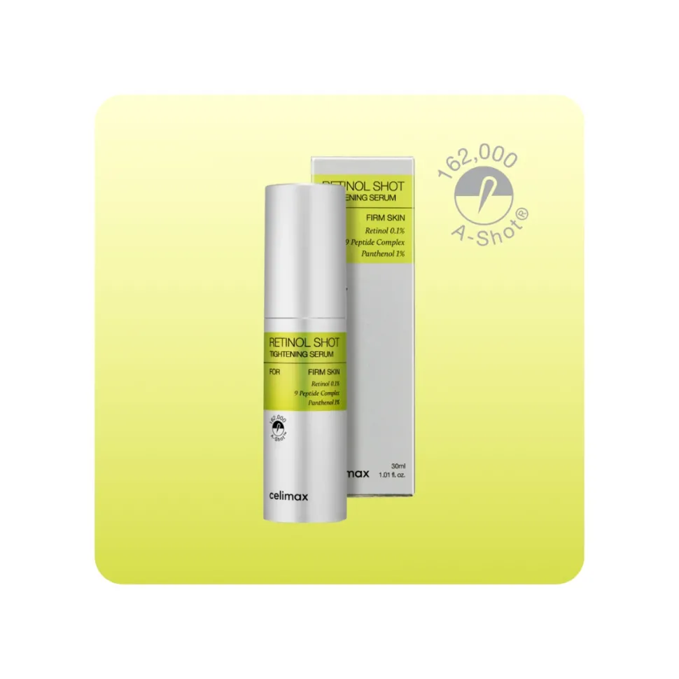¿Buscas un sérum de retinol potente y suave con tu piel? Retinol Shot Tightening Serum combina 0.1% de retinol puro con Micro A-Shot™ y 9 péptidos para mejorar la elasticidad, suavizar la textura y ayudar a minimizar la apariencia de los poros. Fórmula amarilla (sin colorantes) de rápida absorción, con pantenol y vitamina E para mayor confort.