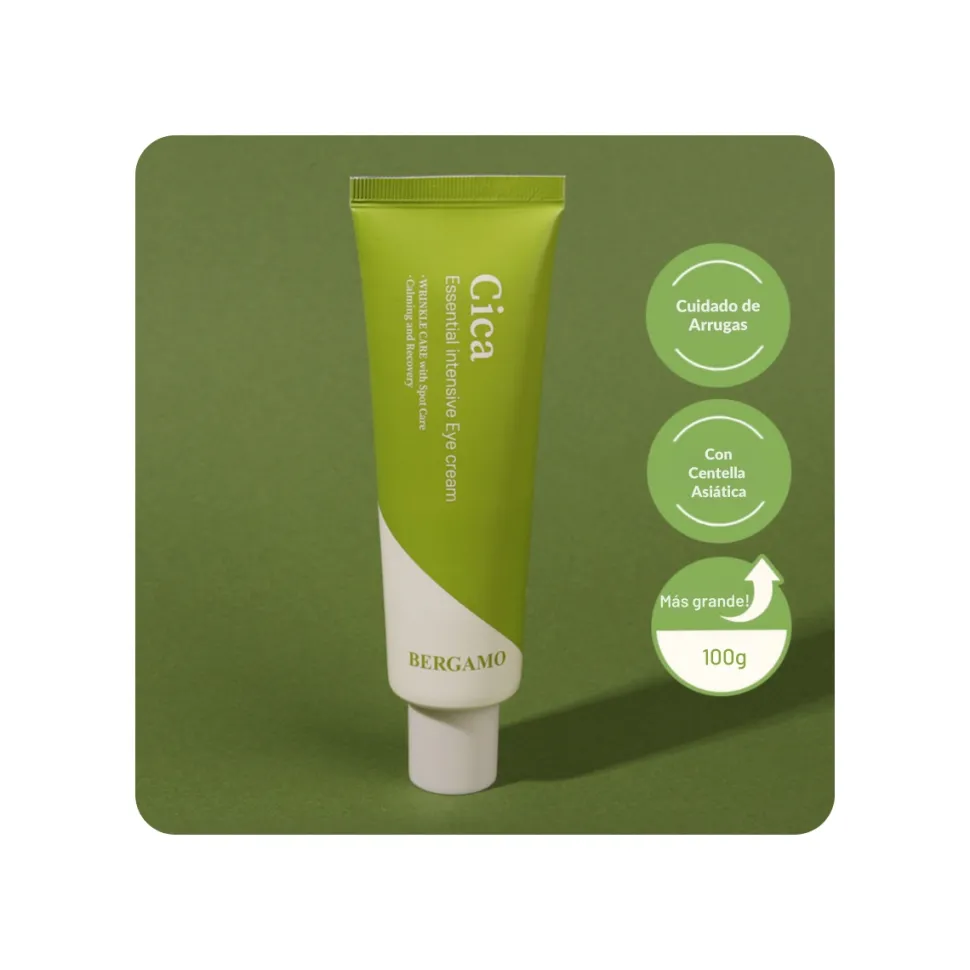 Bergamo Cica Essential Intensive Eye Cream es un contorno de ojos en textura gel, enriquecido con extractos de centella asiática (Cica), que proporciona una hidratación profunda, reduce la apariencia de líneas finas y arrugas, y combate las ojeras y la hinchazón, dejando la piel visiblemente más suave, firme y luminosa.
