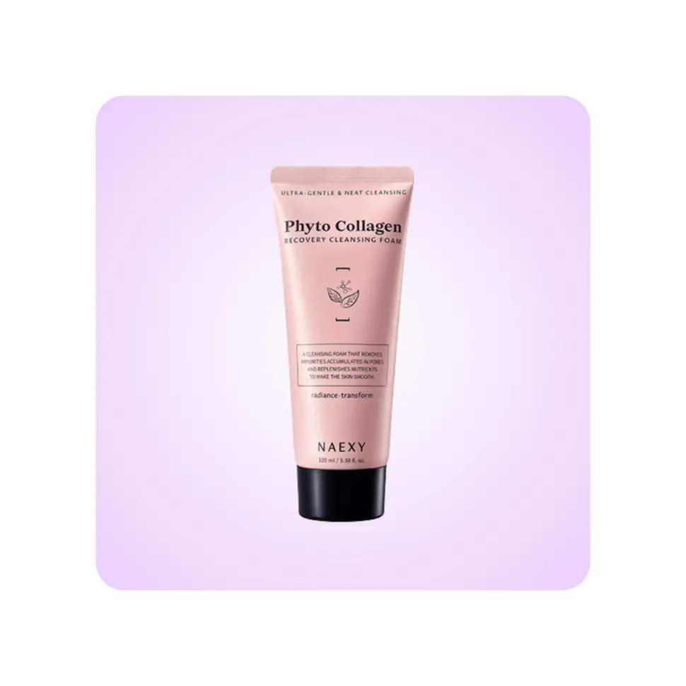 Naexy Phyto Collagen Recovery Cleansing Foam es una espuma facial de textura rica que limpia profundamente, elimina impurezas y maquillaje, mientras aporta beneficios antiedad. Gracias a ingredientes como colágeno soluble y fito-placenta de soja, ayuda a mejorar la firmeza y elasticidad de la piel. Con vitamina C y extractos naturales, combate los radicales libres, unifica el tono y deja el rostro más suave y radiante.