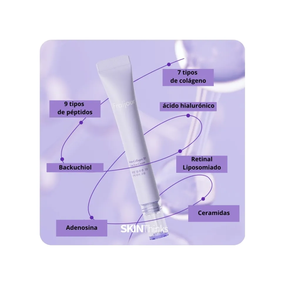 Te vamos a resumir este contorno de ojos de Fraijour: 7 tipos de colágeno, retinal liposomiado, backuchiol, 9 tipos de péptidos, ácido hialurónico, ceramidas y extractos vegetales.