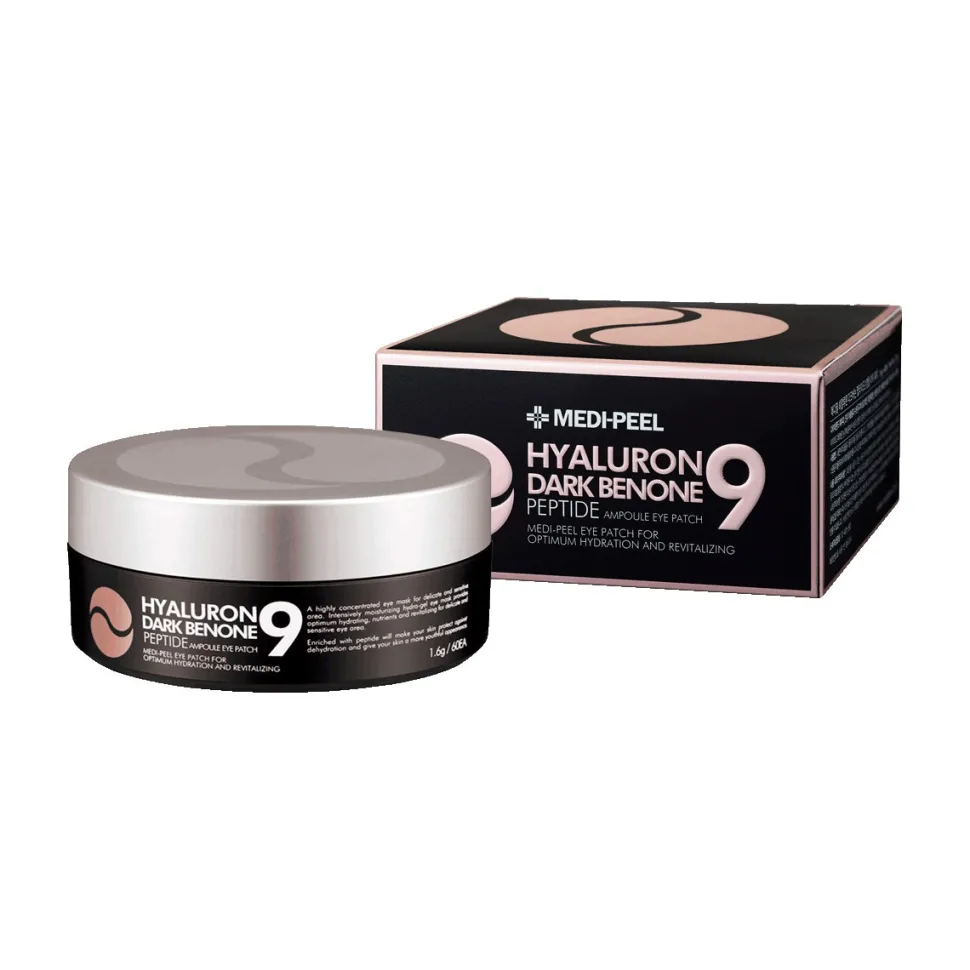 Medi-Peel Hyaluron Dark Benone Peptide 9 Ampoule Eye Patch contienen mucho colágeno, 7 tipos de ácido hialurónico, 9 tipos de péptidos, extracto de perla, vitaminas, polvo de diamante….