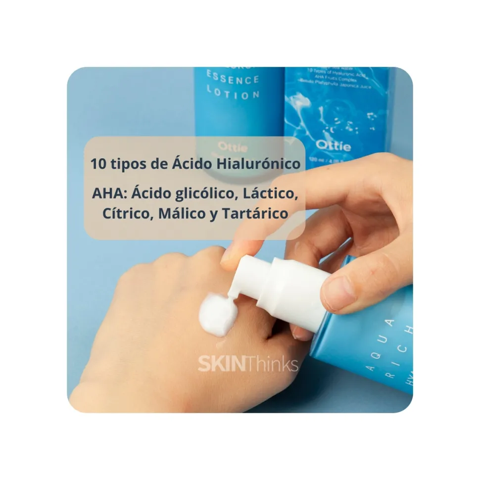 La Ottie Aqua Rich Hyaluron Essence Lotion es una esencia coreana con textura cremosa que combina 10 tipos de ácido hialurónico con un complejo de ácidos de frutas (AHA: glicólico, láctico, cítrico, málico y tartárico) para hidratar y renovar la piel en profundidad.