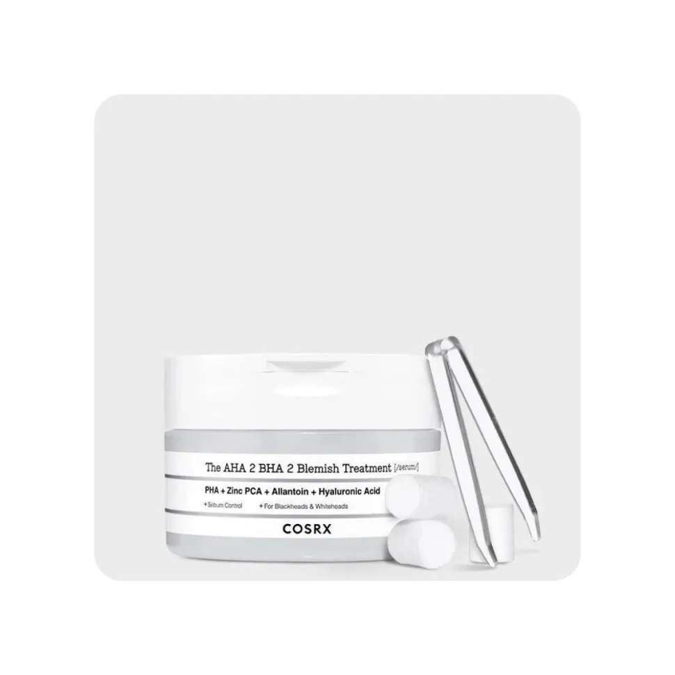 The AHA 2 BHA 2 Blemish Treatment Serum de Cosrx es la solución definitiva para quienes buscan una piel clara, suave y libre de imperfecciones. Este innovador sérum, que incluye 30 bolitas de algodón para una aplicación precisa, combina el poder de 2% de AHA y 2% de BHA para atacar directamente los problemas de la piel.