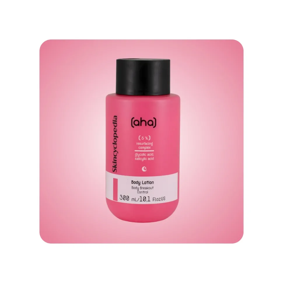 Skincyclopedia Body Lotion 5 Resurfacing Complex enriquecida con un 5% de complejo exfoliante de ácidos AHA y PHA, diseñada para combatir las imperfecciones y la piel áspera.