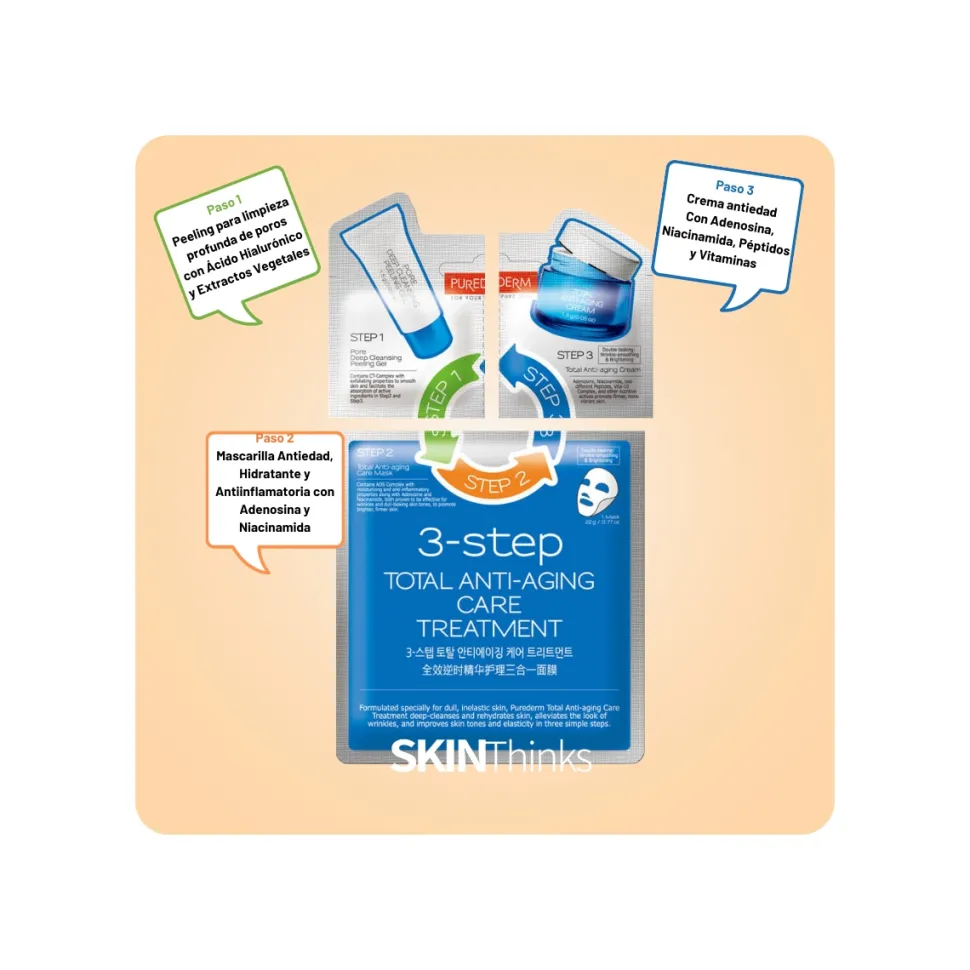 PUREDERM 3-Step Total Anti-Aging Care Treatment es el tratamiento perfecto cuando necesitas darle a tu piel luminosidad, firmeza e hidratación.