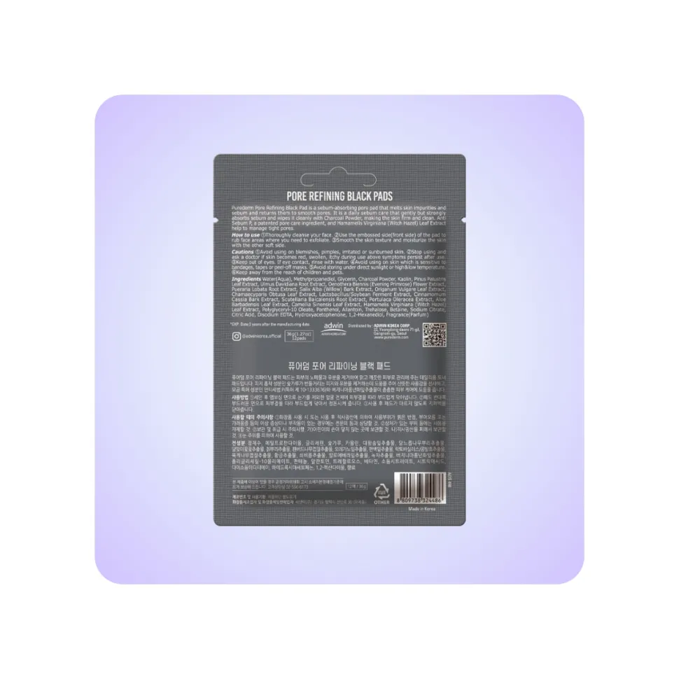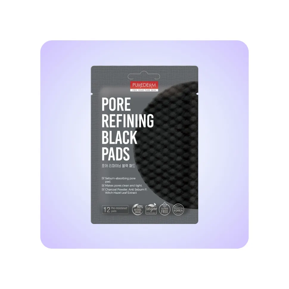 Descubre el secreto coreano para una piel perfecta con PUREDERM Pore Refining Black Pads. Estos discos exfoliantes de carbón activo limpian profundamente, minimizan los poros y controlan el exceso de grasa, revelando una piel suave y radiante.