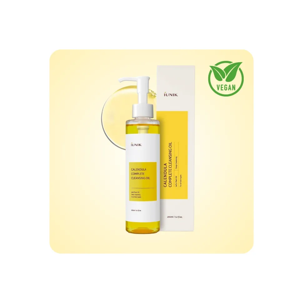 aceite limpiador caléndula, iunik cleansing oil, desmaquillante natural, doble limpieza coreana, aceite jojoba macadamia, limpieza piel sensible, cosmética vegana, oil cleanser.