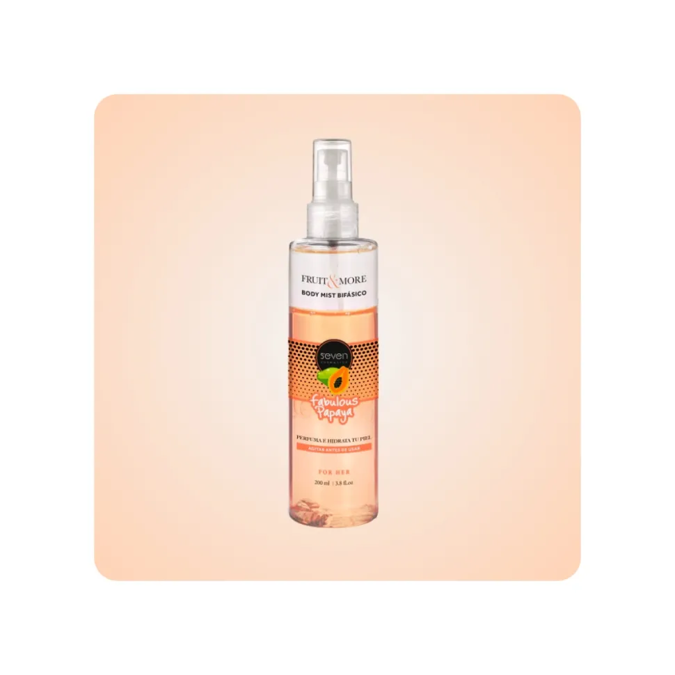 Con la bruma corporal bifásica Fabulous Papaya de Seven Cosmetics, transforma tu rutina diaria en un momento de placer sensorial. Una combinación perfecta entre fragancia exótica e hidratación profunda para que tu piel luzca y se sienta fabulosa.