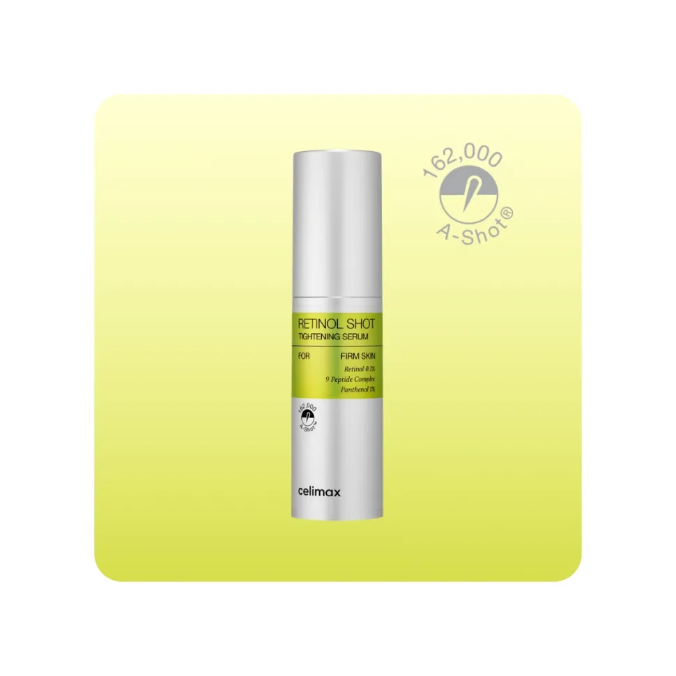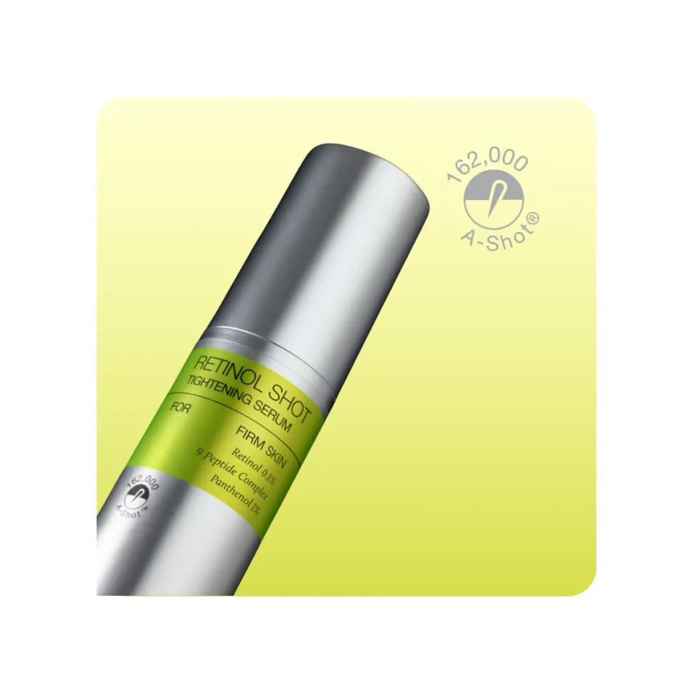 ¿Buscas un sérum de retinol potente y suave con tu piel? Retinol Shot Tightening Serum combina 0.1% de retinol puro con Micro A-Shot™ y 9 péptidos para mejorar la elasticidad, suavizar la textura y ayudar a minimizar la apariencia de los poros. Fórmula amarilla (sin colorantes) de rápida absorción, con pantenol y vitamina E para mayor confort.