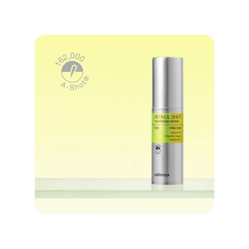 Celimax Retinol Shot Tightening Serum está formulado con 0.1% de retinol puro (vitamina A de alto rendimiento) y la tecnología Micro A-Shot™ —micropartículas que favorecen la absorción de activos— para trabajar de forma sinérgica en elasticidad, textura y apariencia de poros. La fórmula se completa con 9 péptidos, adenosina, pantenol y vitamina E, aportando efecto antiedad y confort.