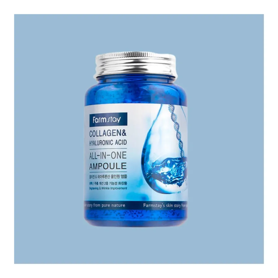 FarmStay Collagen & Hyaluronic Acid All In One Ampoule es un serum súper concentrado con Colágeno Marino, que tiene una estructura similar al que compone la piel. Reafirma y ayuda a reducir la profundidad de las arrugas.