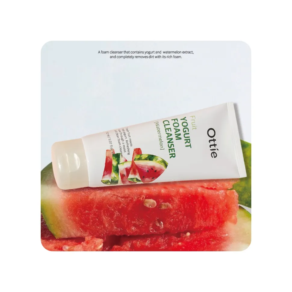 Ottie Fruit Yogurt Foam Cleanser Watermelon, espuma limpiadora de sandía, limpiador facial con yogur, espuma coreana hidratante, limpieza facial nutritiva, limpiador refrescante piel seca